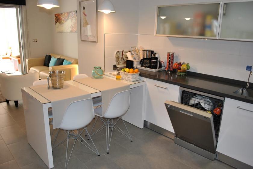 Vardagsrummet är möblerat med luftkonditionering (värme och kyla), platt-TV, SAT-TV, många internationella kanaler och WIFI. Det moderna köket är fullt utrustat med diskmaskin. Från terrassen har du en spektakulär utsikt mot havet och saltsjöarna. I den vackert anlagda gemensamma trädgården hittar du poolen.